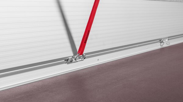 The C-Flex system is a side wall profile made of anodised aluminium with an integrated C lashing groove and enables optimum securing of the goods to be transported due to the flexible sliding lashing eyes. The positioning of the rail on the side wall ensures optimum protection against dirt as well as free use of the floor space. Depending on the model, the low-loaders are equipped with either 4 or 6 lashing eyes, whereby each lashing point is certified with a tensile force of 600 daN. Additional lashing eyes can be retrofitted without tools.