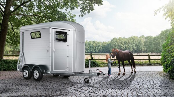 Our model also comes as standard with a quality all-aluminium floor with reinforcement in the horse stall area, a man-sized entrance door, large side opening and sliding windows as well as the anodised aluminium body. Further highlights of our basic equipment are the extra-high automatic support wheel with plastic crank, the 3-point lock on the door, the height-adjustable partition wall with safety stall bar system and tie rings as well as the LED lighting, which can be switched from blue to white.