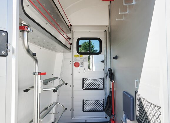 All models have exclusive standard equipment. This includes, for example, the World-Class chassis "WCFplus" according to automotive standards, the Böckmann quality all-aluminium floor, which is guaranteed for 20 years, the rear flap/1-hinged door combination, the proven Multi Safe safety box bar panic system (MSS) for front and rear and the blue LED transport light, which can be conveniently switched from blue to white.