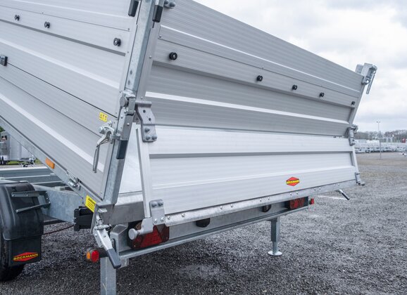 The rear swing flap for tipping trailers facilitates the unloading of the goods to be transported enormously and also with very easy handling. They are made of anodised aluminium and have robust steel mountings.