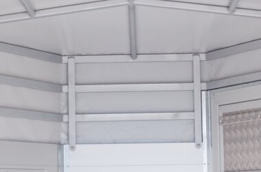 with the solid hoop construction of square tubing (standard feature on all animal trailer models with tarpaulin, VH/VA 3014 and 3016 with hoop construction made of round tubing); the tarpaulin can be rolled up in both diagonal sections at the front for optimum ventilation.