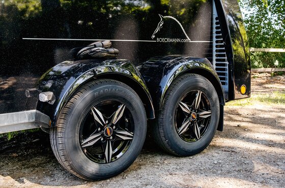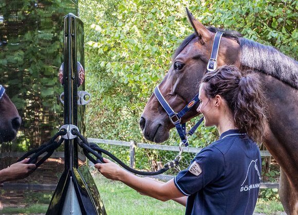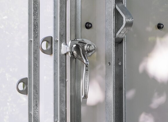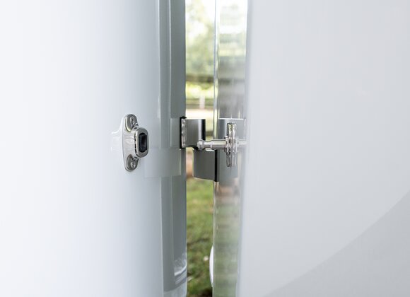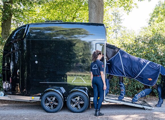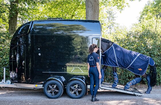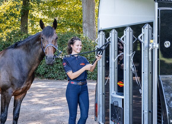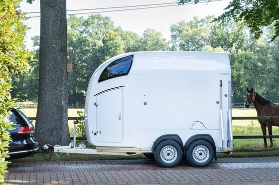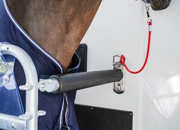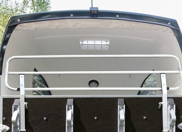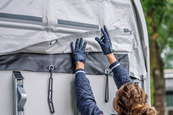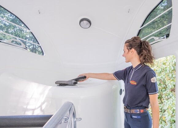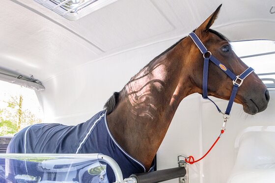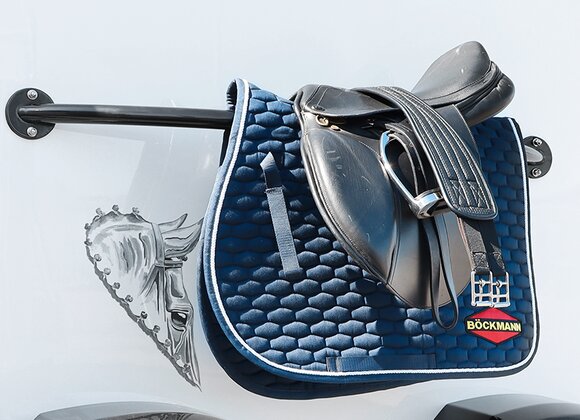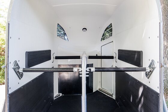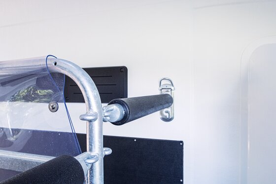 accessible from outside with practical storage options such as 1 shelf. In addition to the horizontally and vertically adjustable as well as pull-out saddle racks, a telescopic broom, plastic shovel, door net, mirror, riding crop holder, large bridle hooks, pad holder, LED light and folding stool with safety catch are also included in the standard equipment.