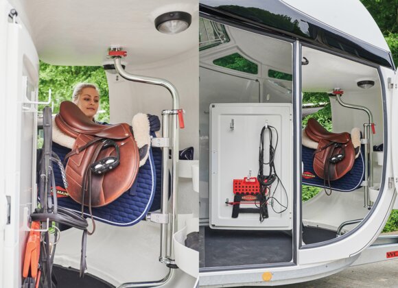 with practical shelves and plenty of storage space, accessible from inside and outside. In addition to the horizontally and vertically adjustable as well as pull-out saddle rack, a telescopic broom, plastic shovel, door net, mirror, riding crop holder, feed troughs, large bridle hooks, pad holder, LED light and folding stool with safety catch are also included in the standard equipment.