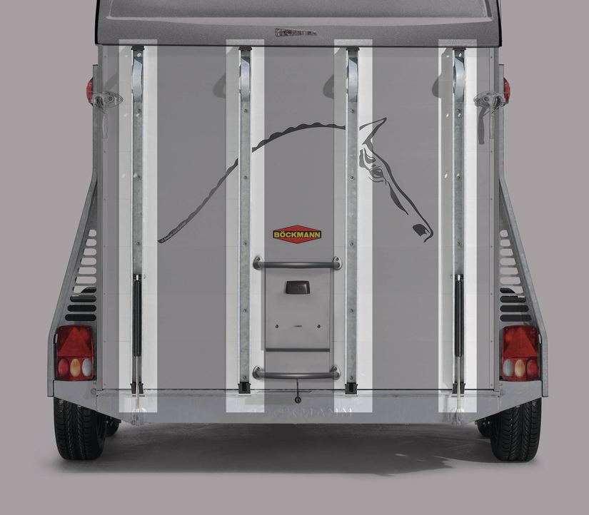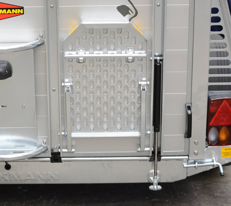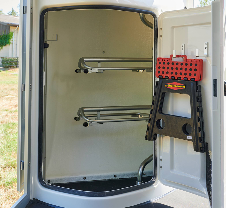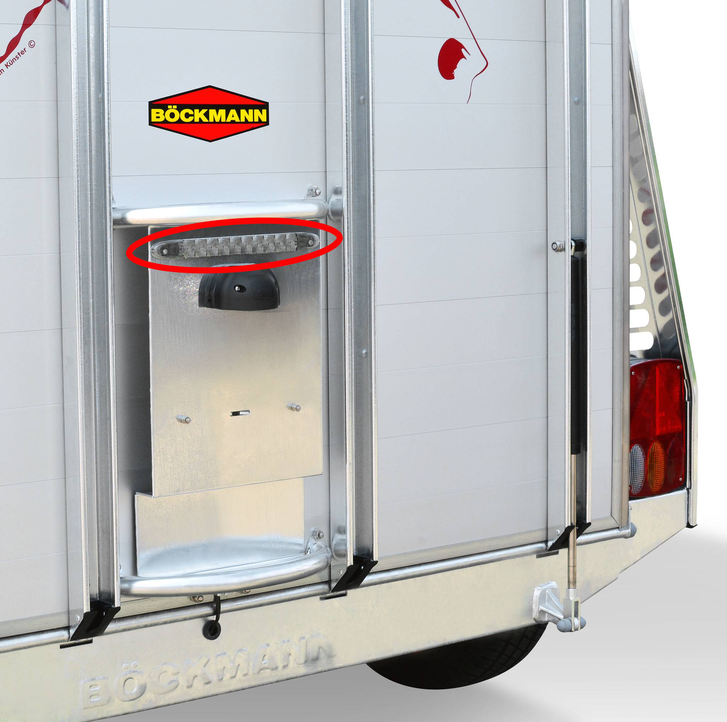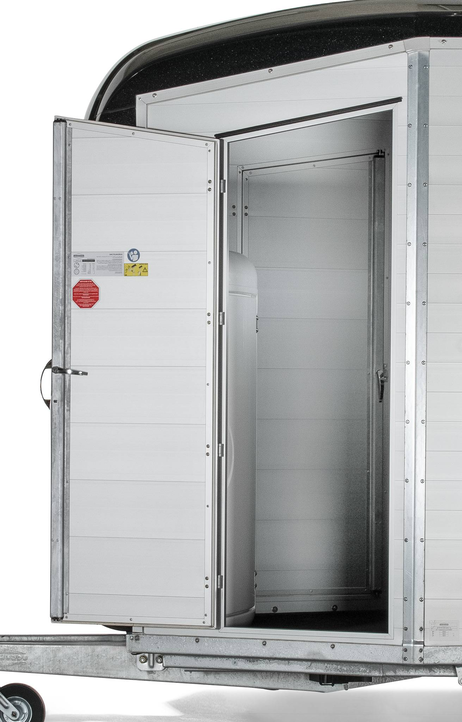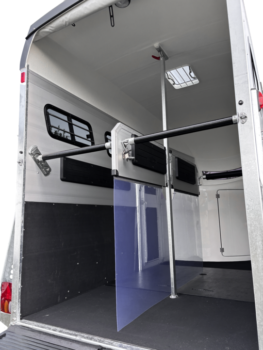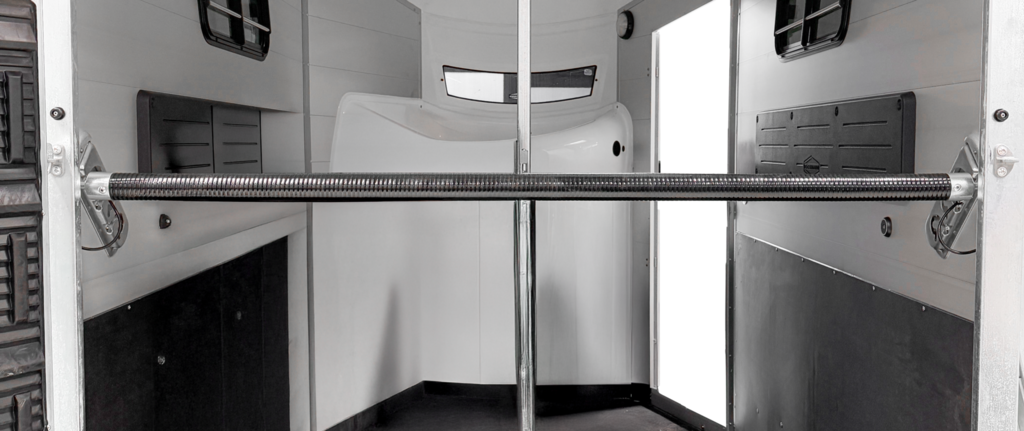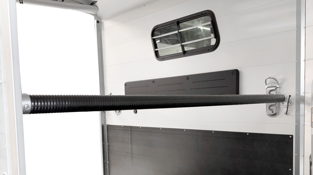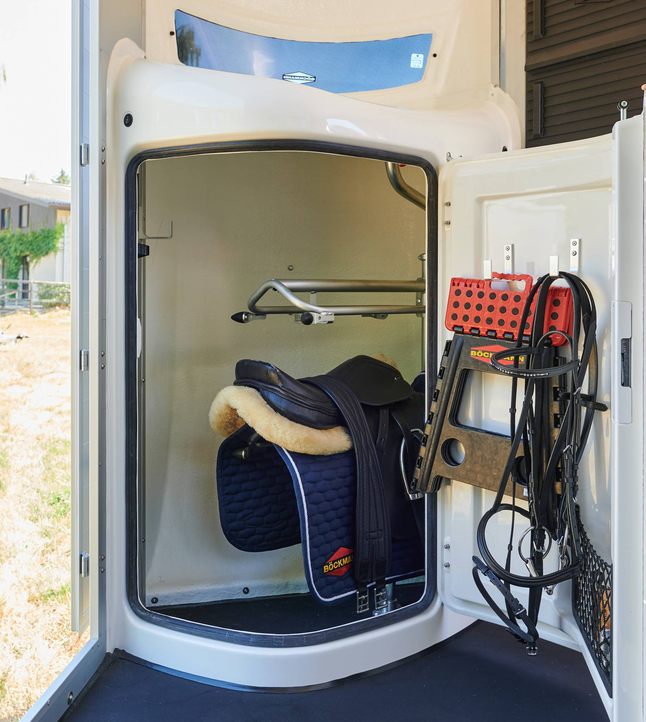 a telescopic broom, plastic shovel, door net, mirror, riding crop holder, feed troughs, large bridle hooks, pad holder, LED light and folding stool with safety catch are also included in the standard features.