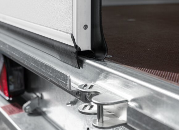 The lashing shackle system is spring-mounted, rattle-proof, easy to lock in place and is flat with the base plate when not in use. Depending on the size of the trailer, the quantity of lashing shackles varies between 6 and 8 pieces. Loadable up to 400 dAN. Further lashing shackles can be retrofitted as accessories.