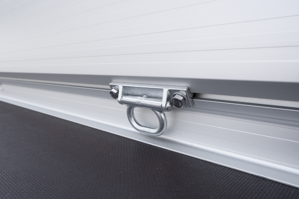 enables the individual lashing eyes to be moved flexibly. DIN 12640 TÜV-certified 600 daN tensile force per lashing point for all lashing angles (vertical, longitudinal and transverse). Completely freely usable base plate without obstacles along the side wall.
