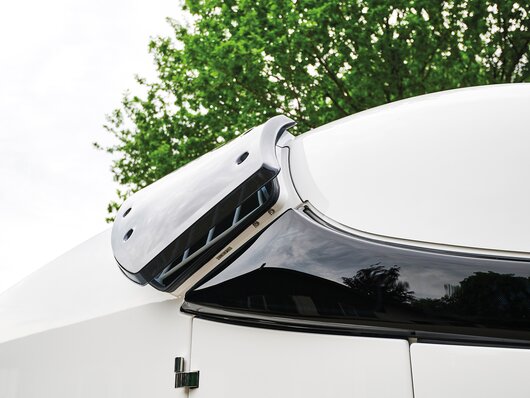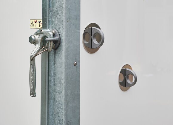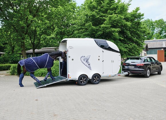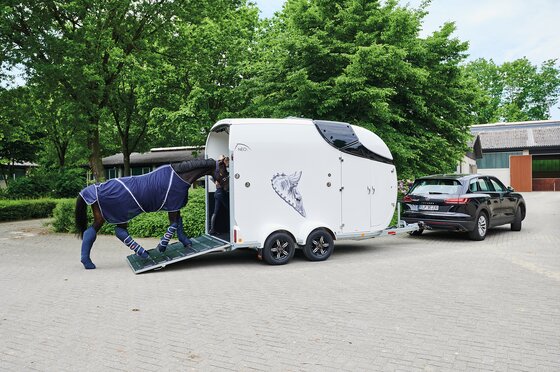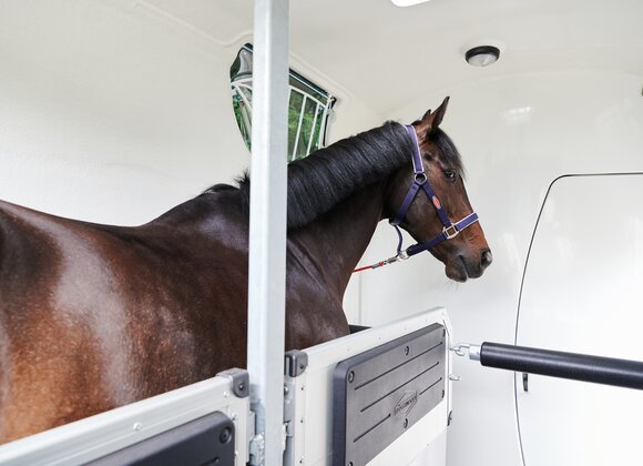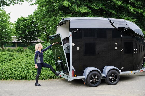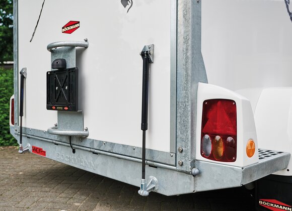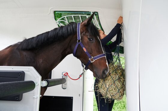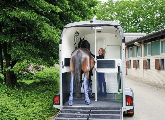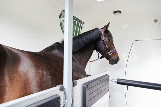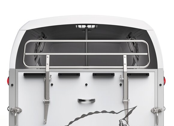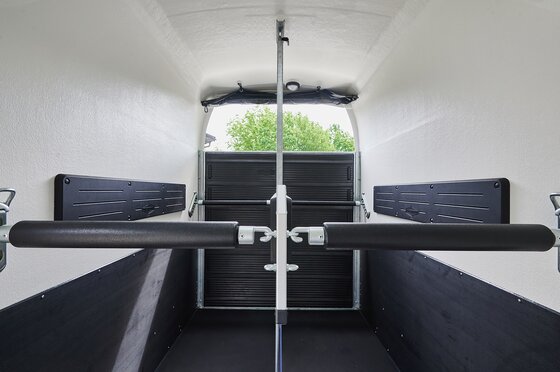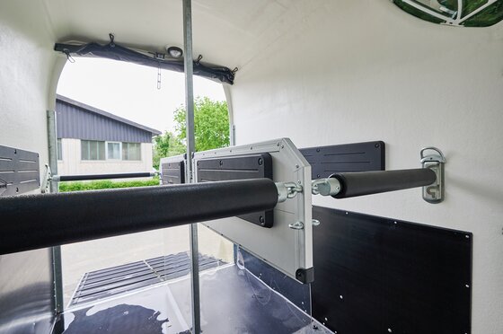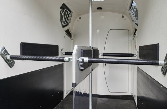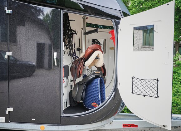 Begaanbare zadelruimte met manshoge toegangsdeur, van binnen en buiten toegankelijk. Naast de in hoogte horizontaal en verticaal verstelbare en uittrekbare zadelhouders maken een telescoopbezem, kunststof schep, deurnet, spiegel, zweephouder, voerbak, grote trenshaken en opklapkrukje met beveiliging deel uit van de standaarduitrusting.