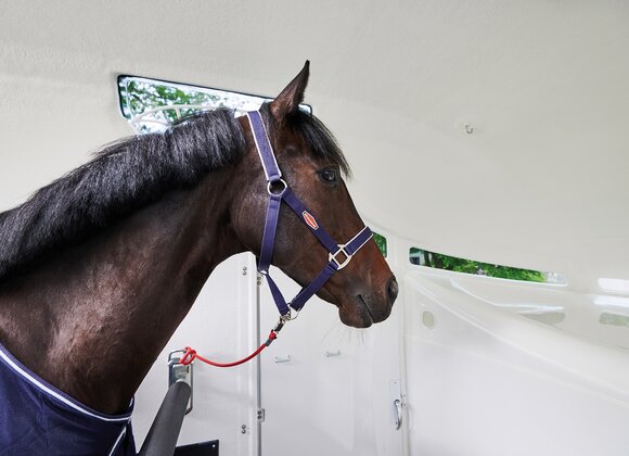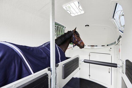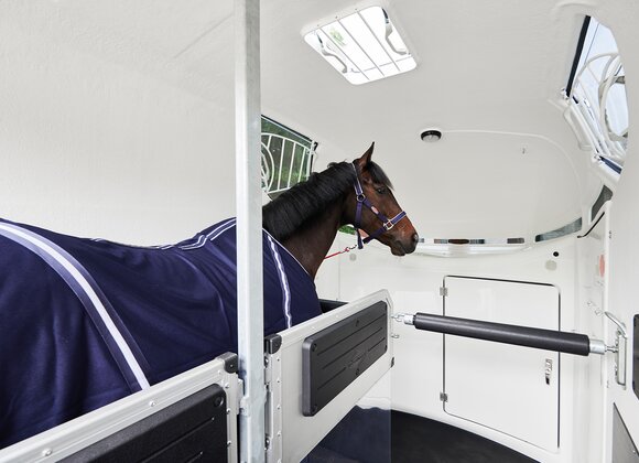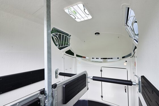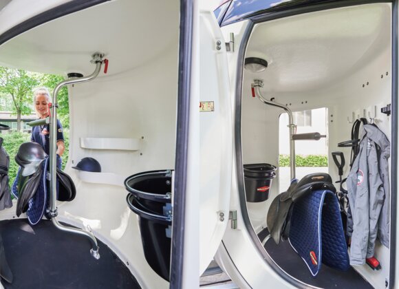 met praktische schappen en veel opbergruimte, van binnen en buiten toegankelijk. Naast de in hoogte horizontaal en verticaal verstelbare en uittrekbare zadelhouders maken een telescoopbezem, kunststof schep, deurnet, spiegel, zweephouder, voerbak, grote trenshaken, pad-houders, led-verlichting, een opklapkrukje met beveiliging deel uit van de standaarduitrusting.