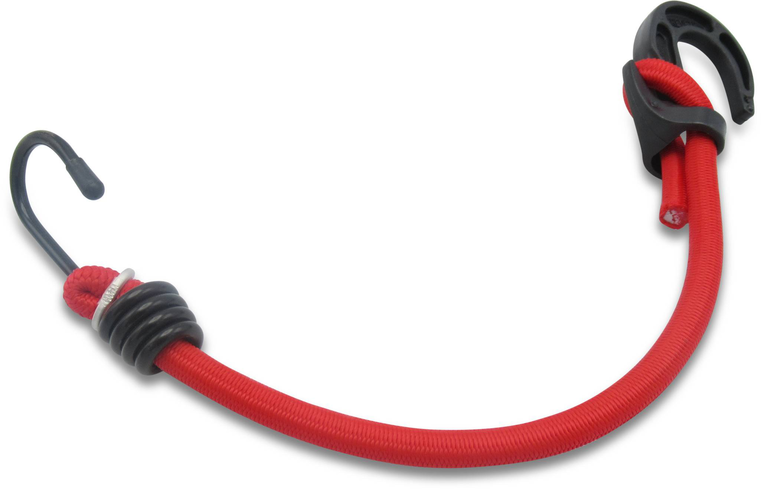 Het rode elastische koord met kunststof en stalen haken is in lengte verstelbaar en is daardoor een praktisch hulpmiddel dat kan worden gebruikt voor ladingzekering.