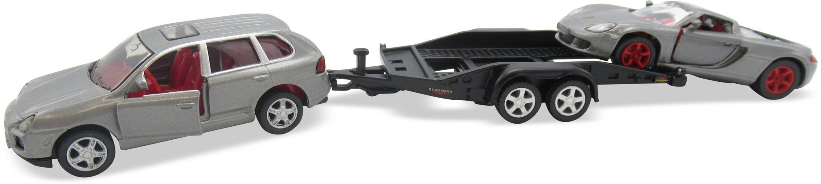 De modelauto met een Porsche als trekkend voertuig en een Böckmann aanhanger inclusief lading. De grotendeels van metaal gemaakte Böckmann tandemasaanhangwagen heeft een kantelbaar laadvlak voor optimale belading.