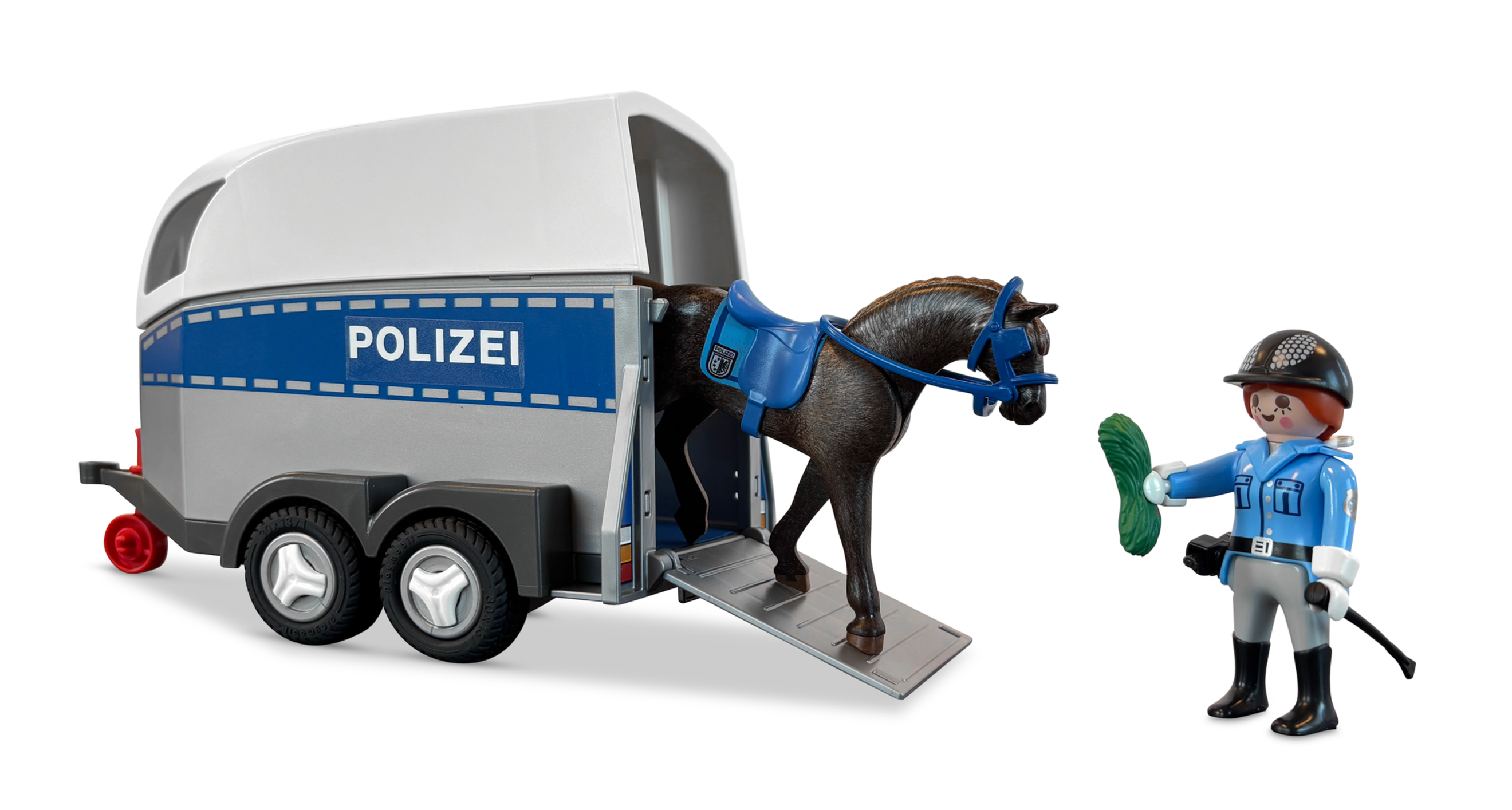 Politietrailer met afneembaar dak voor echte politiefans. De trailer biedt ruimte voor het vervoer van twee paarden.