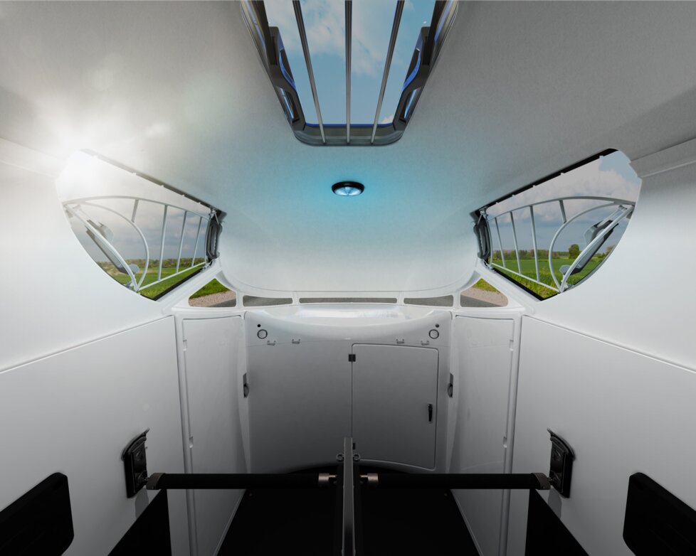 Man weiß, dass Pferde sensibel auf Lichteinflüsse von außen reagieren. Bei dem neuen Lichtkonzept des Neo wurde dies besonders berücksichtigt: der Lichtbogen verhindert, dass das Pferd durch den entgegenkommenden Verkehr geblendet wird und ermöglicht einen natürlichen Einfall von indirektem Licht. Die eingesetzten, getönten Panoramaseitenfenster sind aufstellbar und sorgen für eine optimale Belüftung. Sie verfügen über die größte Fensterfläche in der Polyesterklasse und bewirken damit einen sehr hellen Innenraum. Dieser wirkt auf das Fluchttier Pferd deutlich weniger angsteinflößend und kann das Verladen auf den Anhänger um einiges erleichtern. Das neuartige Lichtkonzept ermöglicht, dass sehr viel Tageslicht in die Sattelkammer und in den Pferderaum fällt.