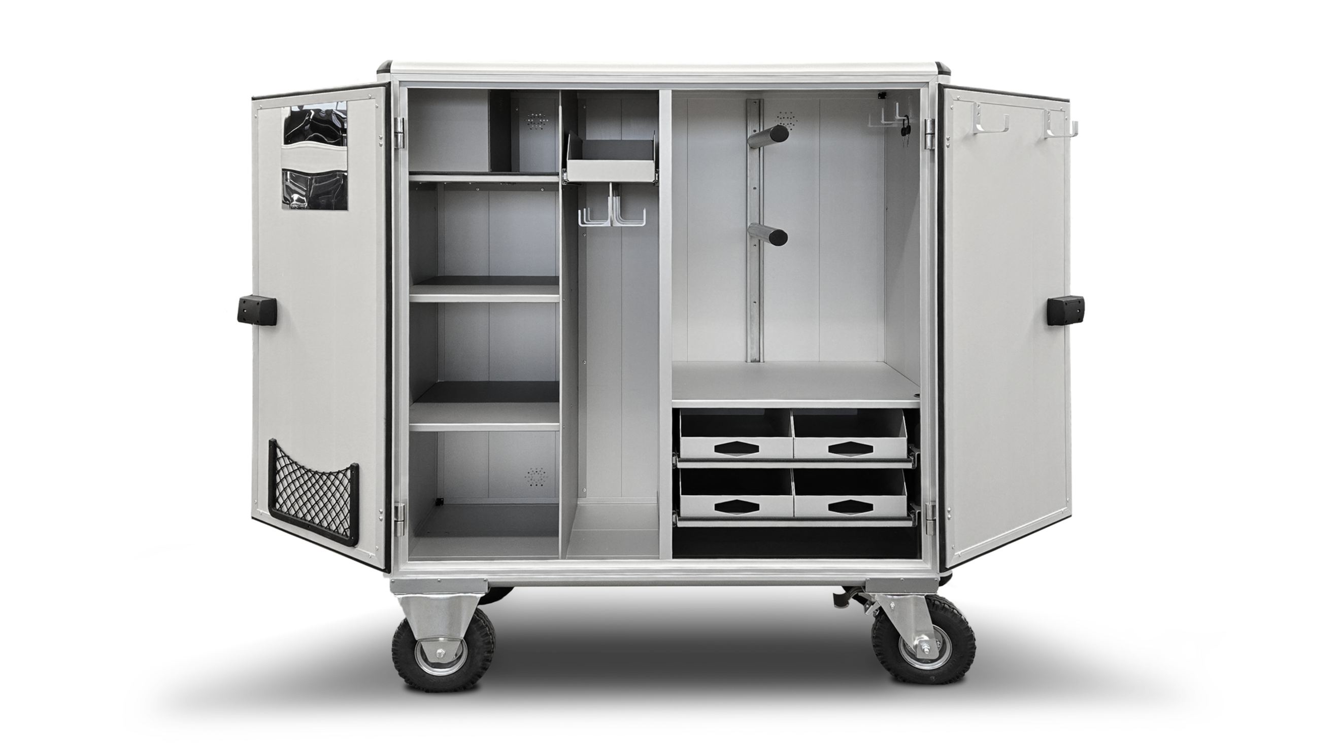 Die Mobilität des Sattelschranks wird durch großvolumige Bereifung mit zwei Block- und zwei Lenkrollen sichergestellt, sodass er innerhalb der Stallungen und auf dem Reitplatz leicht bewegt werden kann. Stabile Rangierbügel und Zugösen erleichtern den Transport zusätzlich.