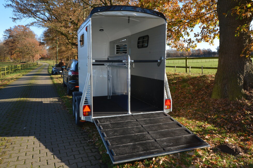 Our model also comes as standard with a quality all-aluminium floor with reinforcement in the horse stall area, a man-sized entrance door, large side opening and sliding windows as well as the anodised aluminium body. Further highlights of our basic equipment are the extra-high automatic support wheel with plastic crank, the 3-point lock on the door, the height-adjustable partition wall with safety stall bar system and tie rings as well as the LED lighting, which can be switched from blue to white.