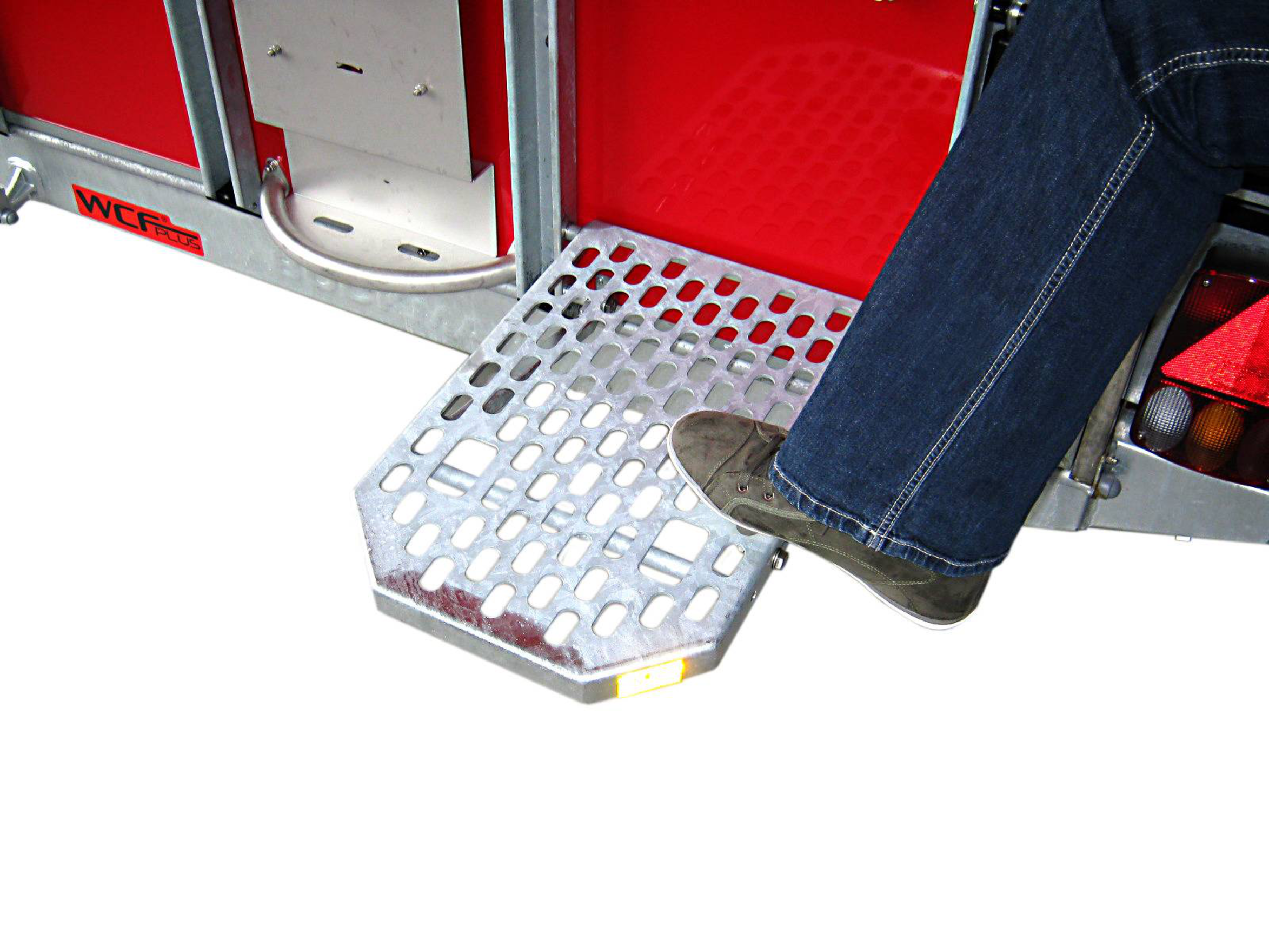 The mounting aid is installed on the tailgate of the horse trailer and folded out when in use. It makes it easier to mount the horse.