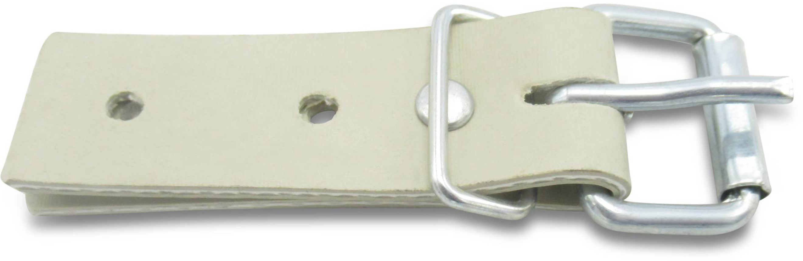Strap with abrasion pad for horse trailers with tarpaulin cover.