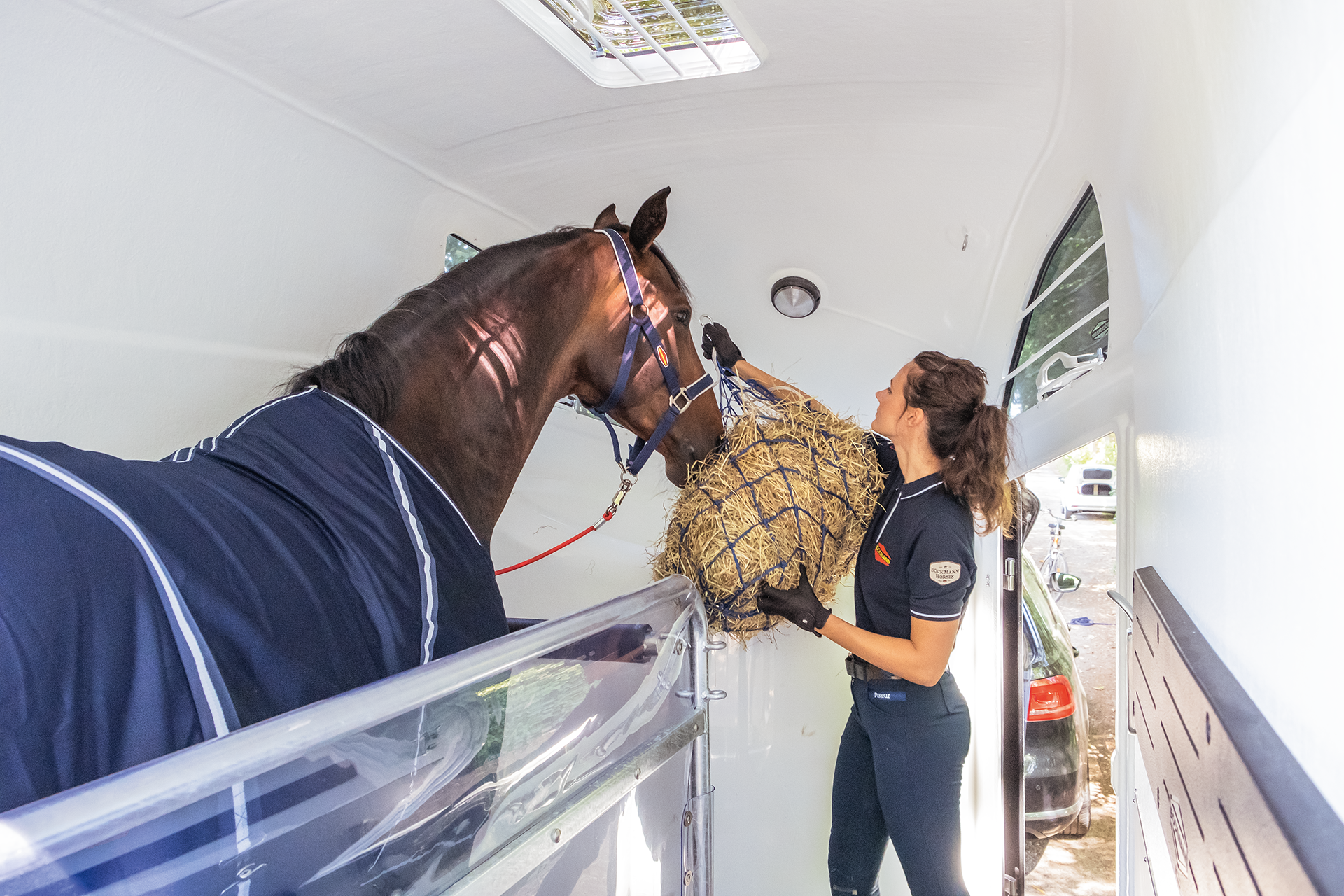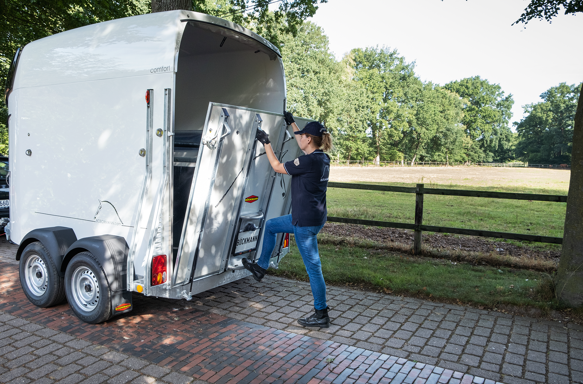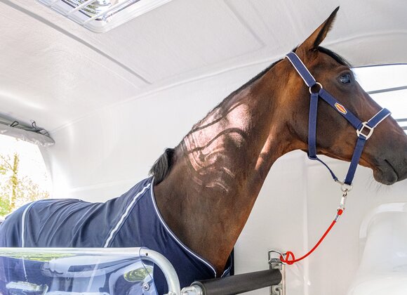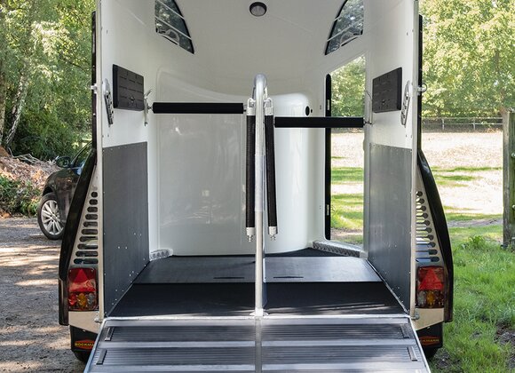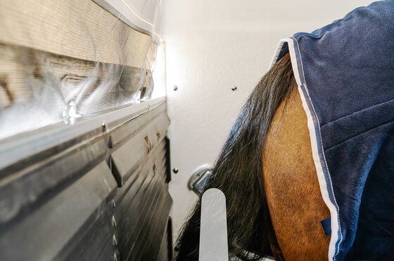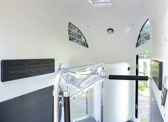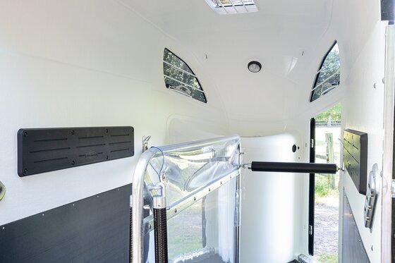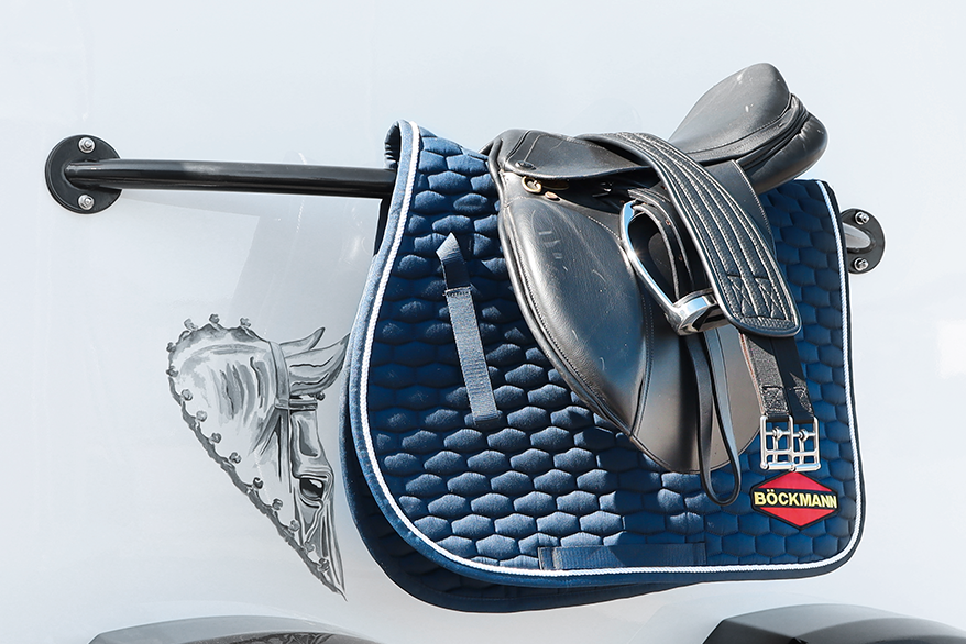 accessible from outside with practical storage options such as 1 shelf. In addition to the horizontally and vertically adjustable as well as pull-out saddle racks, a telescopic broom, plastic shovel, door net, mirror, riding crop holder, large bridle hooks, pad holder, LED light and folding stool with safety catch are also included in the standard equipment.