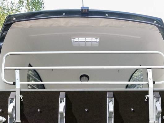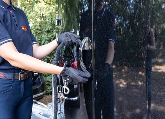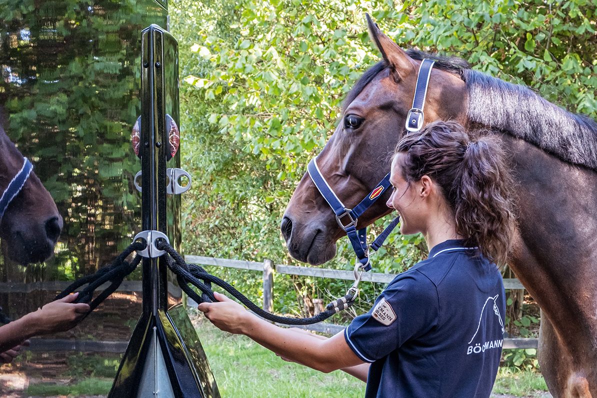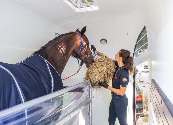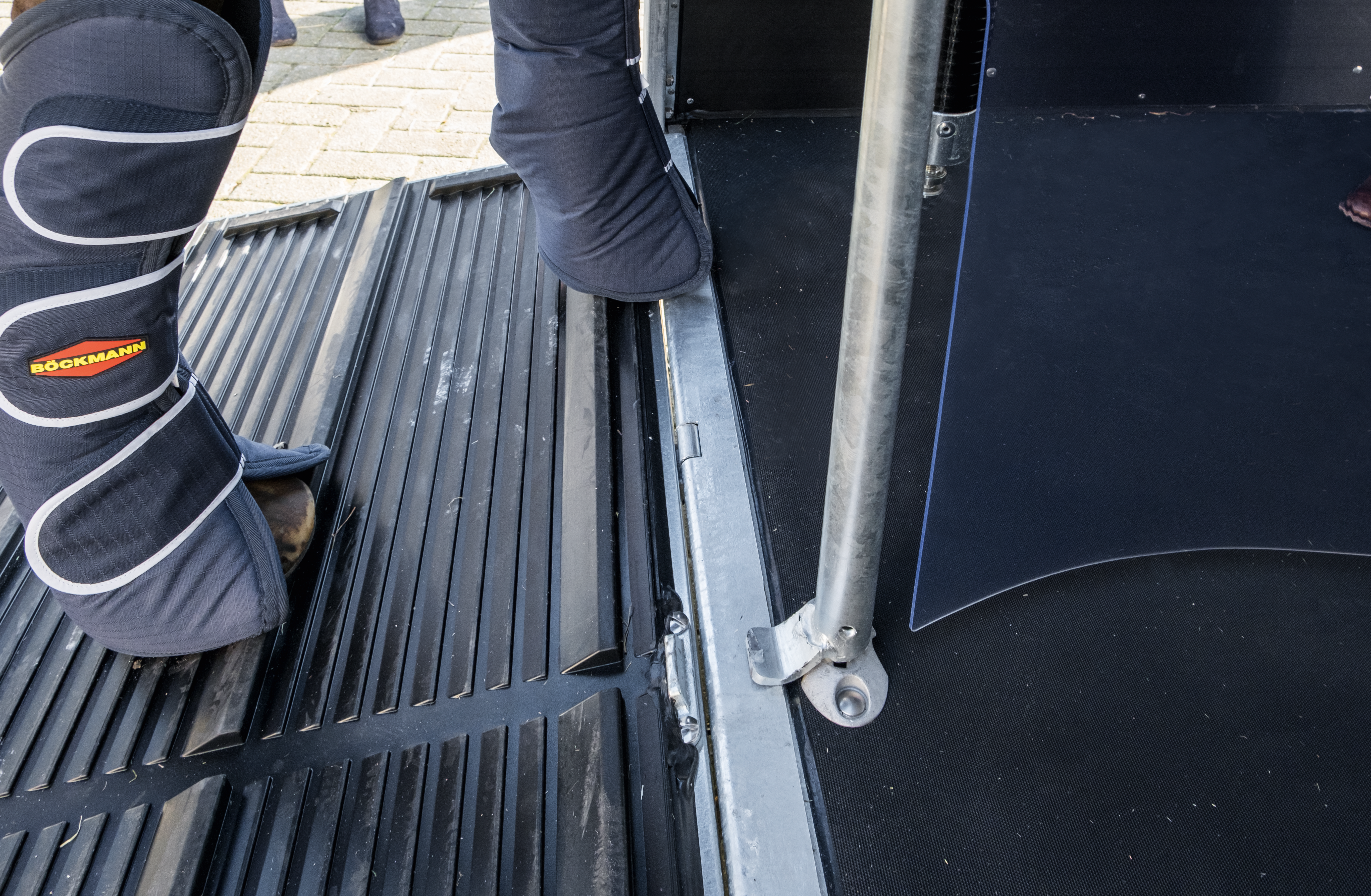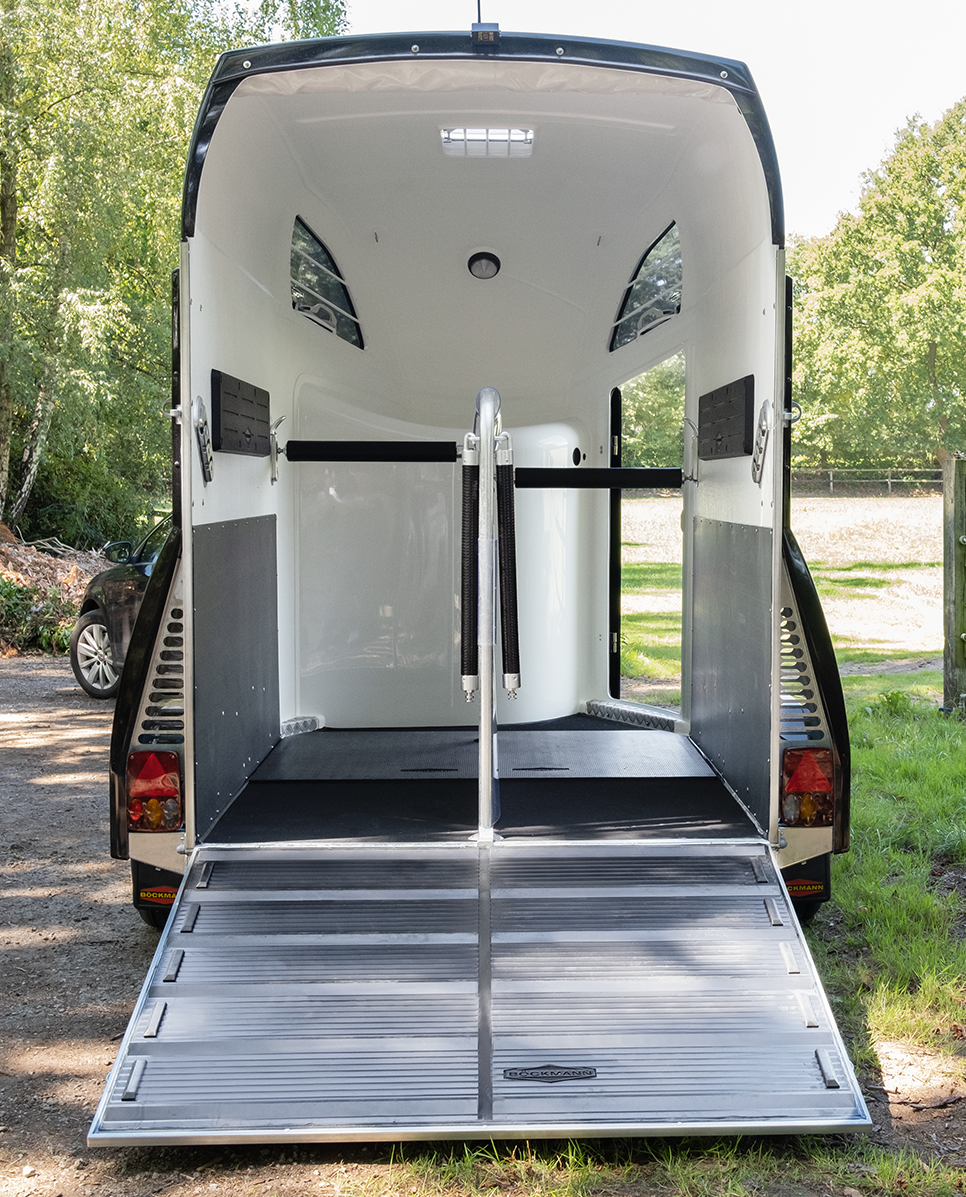 accessible from outside with practical storage options such as 1 shelf. In addition to the horizontally and vertically adjustable as well as pull-out saddle racks, a telescopic broom, plastic shovel, door net, mirror, riding crop holder, large bridle hooks, pad holder, LED light and folding stool with safety catch are also included in the standard equipment.