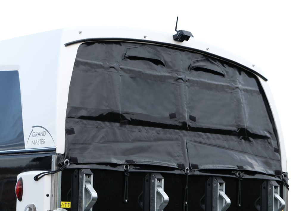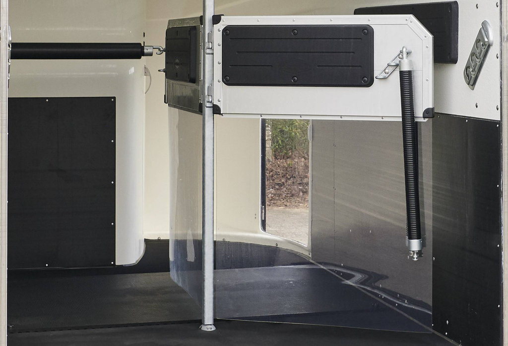 Walk-in tack locker with full-height access door, conveniently accessible from inside and outside. In addition to the horizontally and vertically adjustable as well as pull-out saddle rack, a telescopic broom, plastic shovel, door net, mirror, riding crop holder, feed troughs, large bridle hooks and folding stool with safety catch are also included in the standard equipment