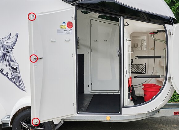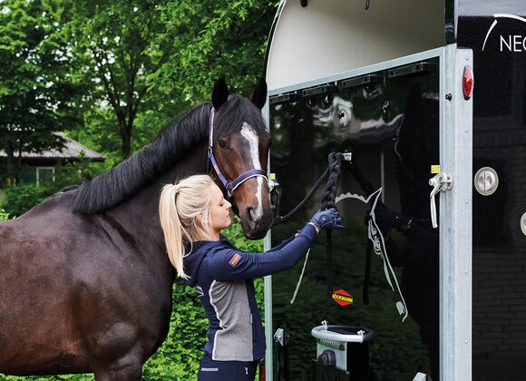 Walk-in tack room with full-height access door, conveniently accessible from inside and outside. In addition to the horizontally and vertically adjustable as well as pull-out saddle rack, a telescopic broom, plastic shovel, door net, mirror, riding crop holder, feed troughs, large bridle hooks and folding stool with safety catch are also included in the standard equipment.