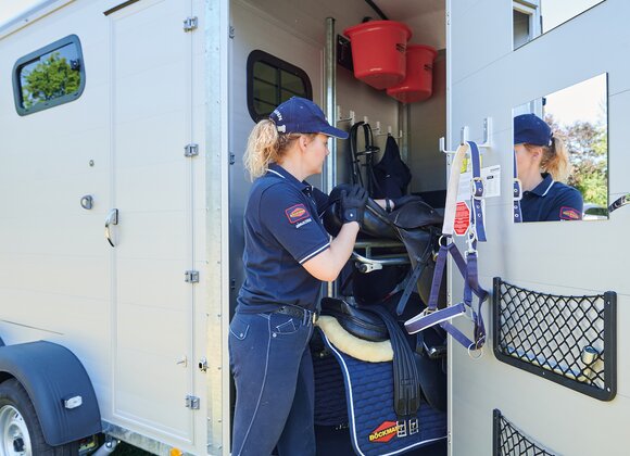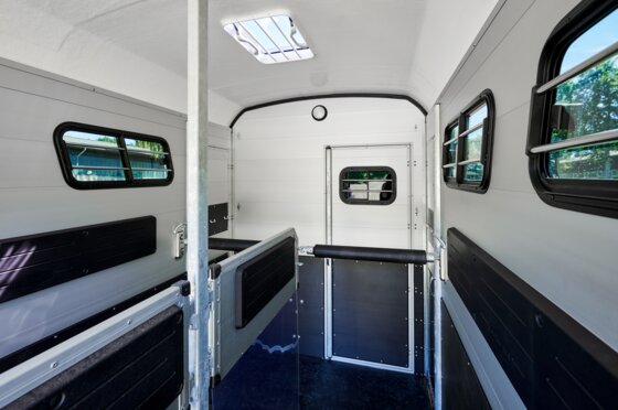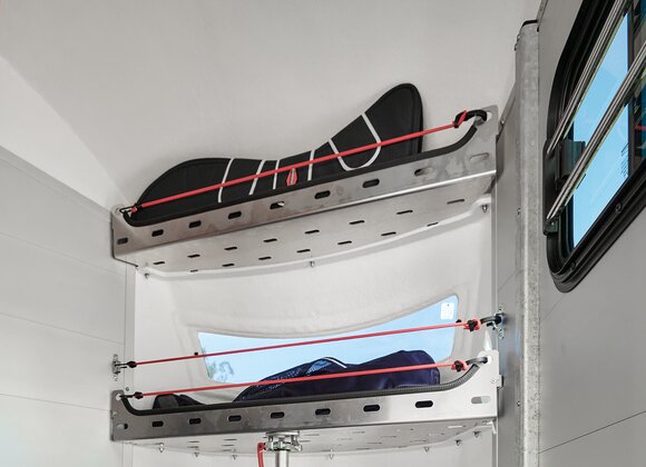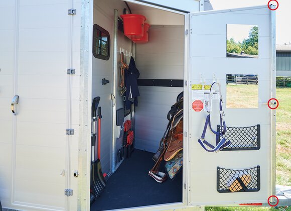 a telescopic broom, plastic shovel, door net, mirror, riding crop holder, feed troughs, large bridle hooks, pad holder, LED light, folding seat, boot jack and folding stool with safety catch are also included in the standard features.