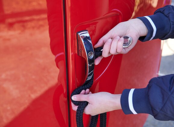 Fondamentalement, il n'y a pas de bords tranchants à l'intérieur ou sur l'ensemble du véhicule, seulement des coins arrondis. Les charnières et les têtes de vis sont également arrondies. Chaque coin est doté d'un cache en plastique. Toutes les poignées de porte sont proches du corps pour empêcher la corde de s'y coincer accidentellement. Les fenêtres bénéficient d'une protection UV et sont protégées par une grille, tandis que les montants arrière perforés spécialement empêchent un sabot de glisser à travers. Les verrouillages à levier d'angle robustes, qui peuvent pivoter à 180 degrés, minimisent le risque supplémentaire. Les barres des box ont un rembourrage supplémentaire, et les coussinets latéraux sur les parois latérales offrent une protection supplémentaire. Cela permet de prévenir les blessures dues à un freinage ou à une accélération brutale.