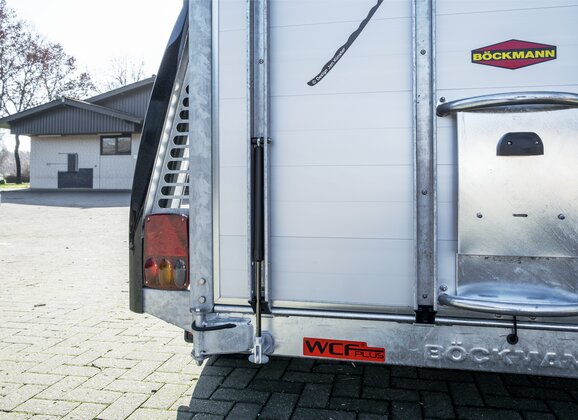 La plupart des véhicules sont équipés du châssis WCF spécial avec suspension indépendante galvanisée, suspension à ressorts hélicoïdaux et amortisseurs de roue, ce qui assure un confort de conduite supérieur. De plus, pour Böckmann, la qualité des matériaux et des composants utilisés est très importante. Chaque véhicule est produit de manière extrêmement stable et sécurisée. Être sûr signifie entre autres que le poids du cheval, qui est exercé à la fois sur les parois latérales, le sol mais aussi en partie de manière ponctuelle, ne pose aucun problème - même en cas d'accident.