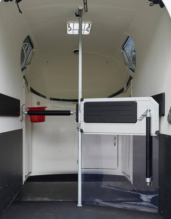 Espace sellerie accessible à pied de l’intérieur et de l’extérieur avec porte à hauteur d’homme. Outre les portes-selles réglables et extensibles, un balai télescopique, une pelle en plastique, un filet de porte, un miroir, des porte-cravaches, des mangeoires, de grands crochets porte-bride et un tabouret pliant avec dispositif de sécurité font partie de l'équipement standard.