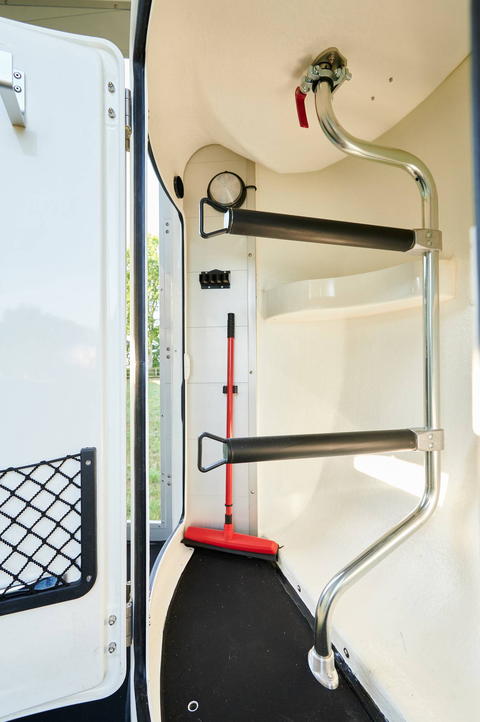 Outre les porte-selles professionnels réglables horizontalement et verticalement ainsi que les porte-selles extensibles, un balai télescopique, une pelle en plastique, un filet de porte, un miroir, un porte-cravache, des mangeoires, de grands crochets porte-bride, un porte-tapis de selle, un éclairage LED et un tabouret pliant avec dispositif de sécurité font partie de l'équipement standard.