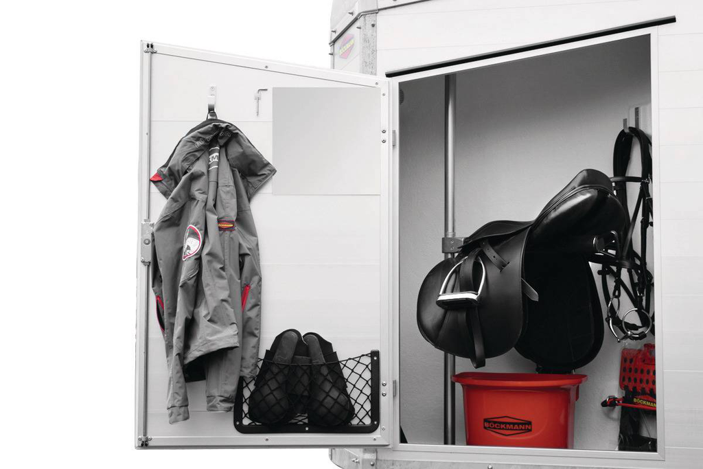 accessible de l'extérieur avec un porte-selle extensible, rembourré et réglable en hauteur, des crochets de bridon positionnés de manière optimale, un porte cravache, une pelle en plastique, un balai télescopique, un miroir et un filet de porte à l'intérieur de la porte, ainsi qu'un tabouret pliant avec sécurité et éclairage LED.