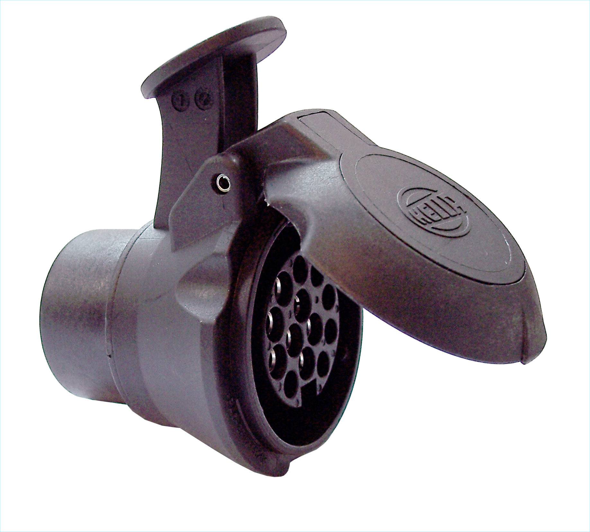 L?adaptateur pour une prise à 7 broches sur le véhicule tracteur et une prise à 13 broches sur la remorque connecte les différents types de prises des deux véhicules.