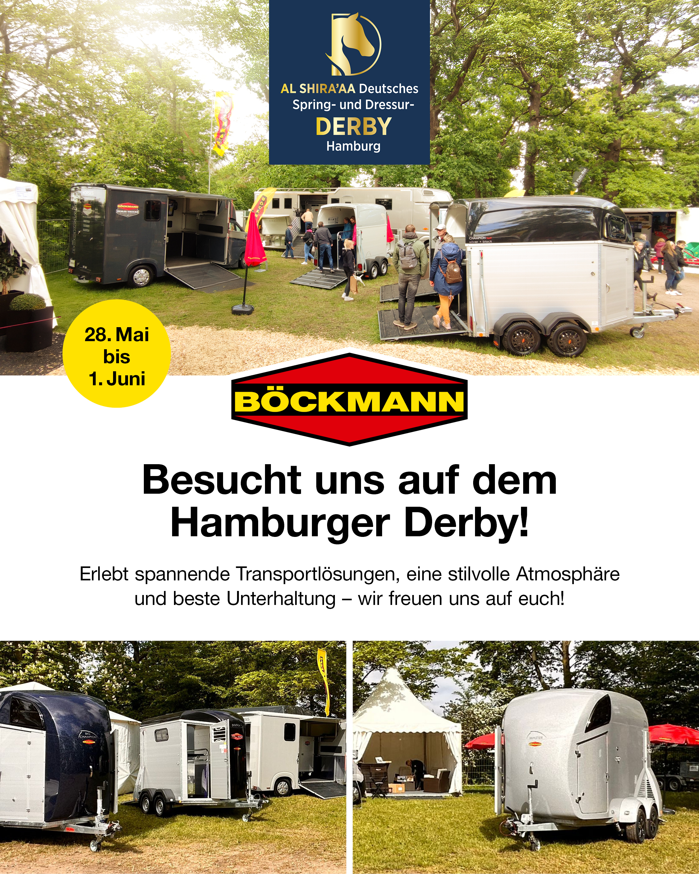 Böckmann zal aanwezig zijn bij de Hamburger Derby met een selectie van zijn nieuwste modellen van paardentrailers en paardenvrachtwagens. Daaronder het populaire Compact paardentransportermodel, onder andere met een Mercedes Benz opbouw. Dit model verenigt de uitzonderlijke kwaliteit van de Böckmann-aluminiumopbouw met die van de Mercedes Sprinter en biedt een unieke rijstabiliteit.
