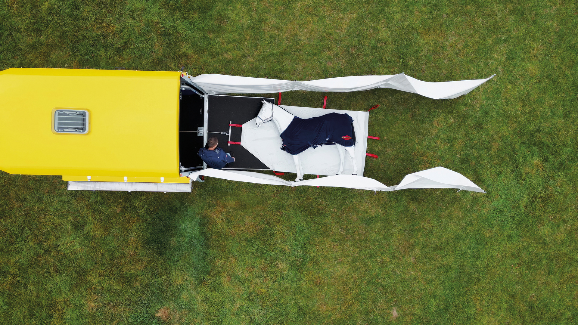 Een opvallend kenmerk van de ambulanceaanhanger is de standaarduitrusting, waaronder een draagzeil en een elektrische lier met accu. Hierdoor kan een liggend paard veilig en voorzichtig op de aanhanger worden geladen. Voor staande maar gewonde paarden biedt de aanhanger extra stabilisatie: twee gewatteerde scheidingswanden met boxstangen zorgen voor ondersteuning en kunnen indien nodig met enkele handelingen worden verwijderd om ruimte te maken voor een liggend dier.
