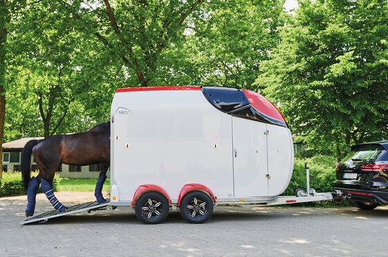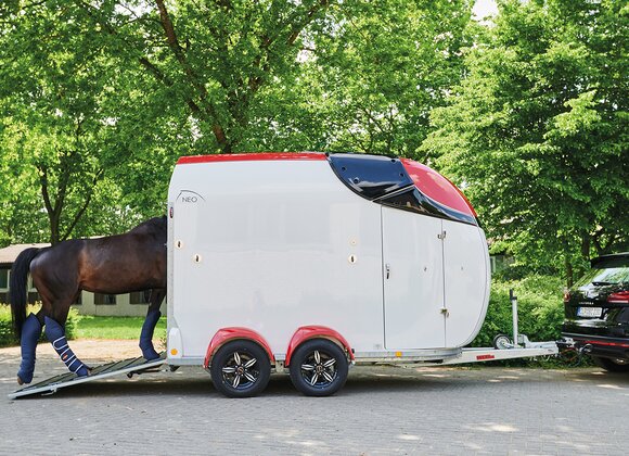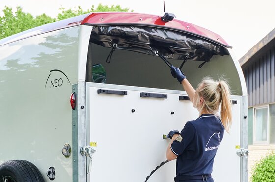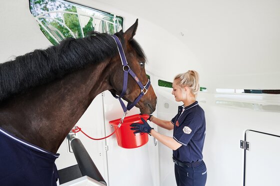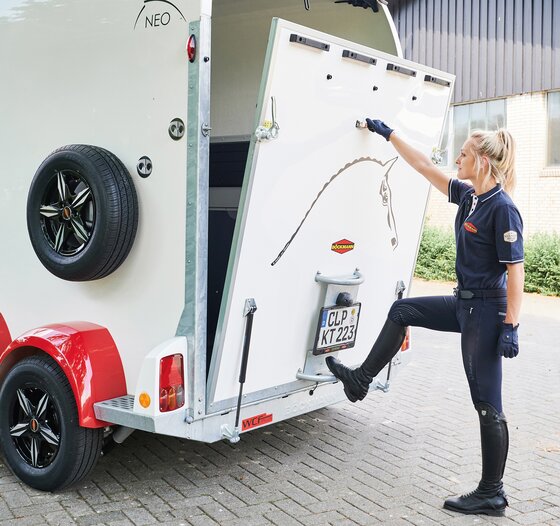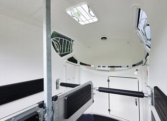 met praktische schappen en veel opbergruimte, van binnen en buiten toegankelijk. Naast de in hoogte horizontaal en verticaal verstelbare en uittrekbare zadelhouders maken een telescoopbezem, kunststof schep, deurnet, spiegel, zweephouder, voerbak, grote trenshaken, pad-houders, led-verlichting, een opklapkrukje met beveiliging deel uit van de standaarduitrusting.